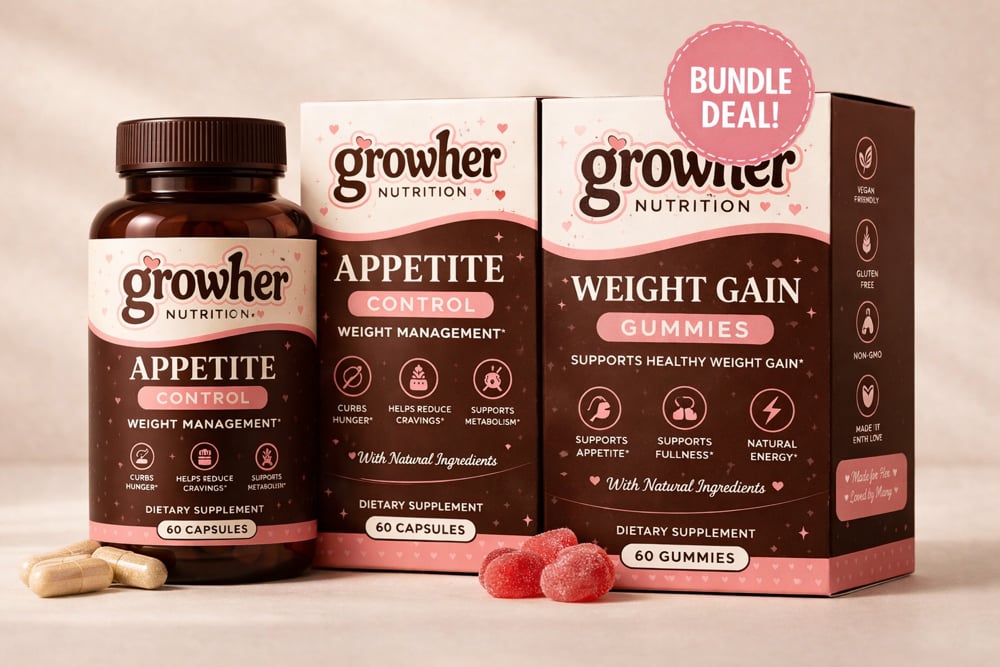 Get the best of both worlds with the Grow Her Ultimate Gain Bundle — your complete system for maximizing results. This bundle combines our powerful Appetite+ Capsules and Curves Boost Gummies to give your body full-spectrum support for healthy weight gain.